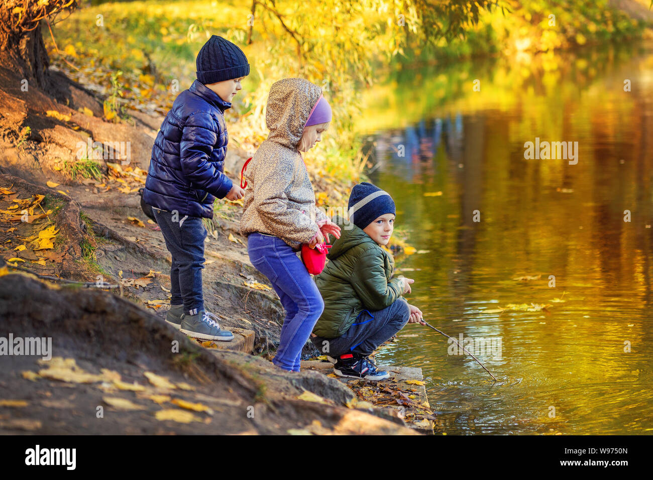 Three Children Friends Playing Fishing With Sticks Near Pond In Beautiful Golden Fall Park Little Siblings Having Fun Near Lake Or River In Autumn Stock Photo Alamy